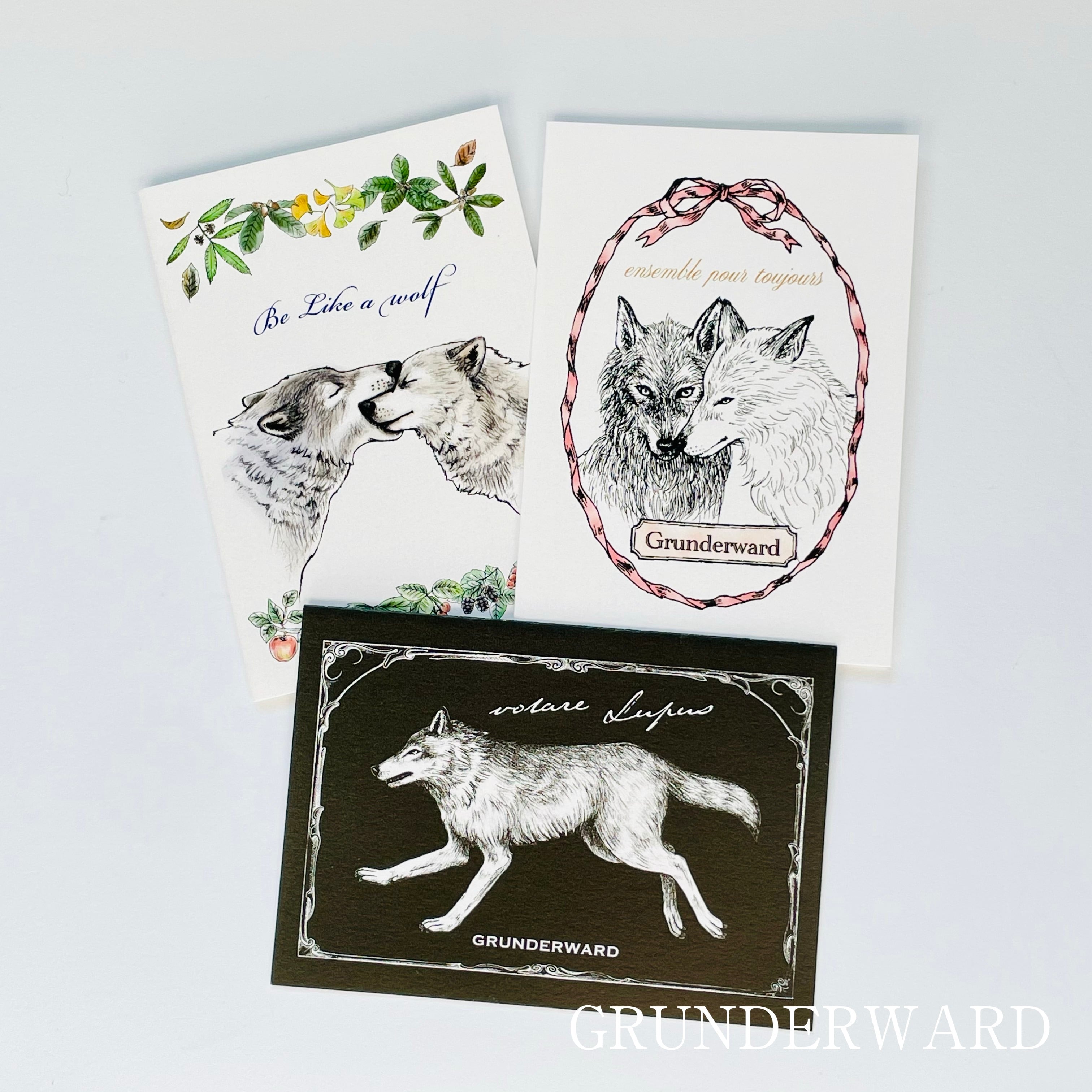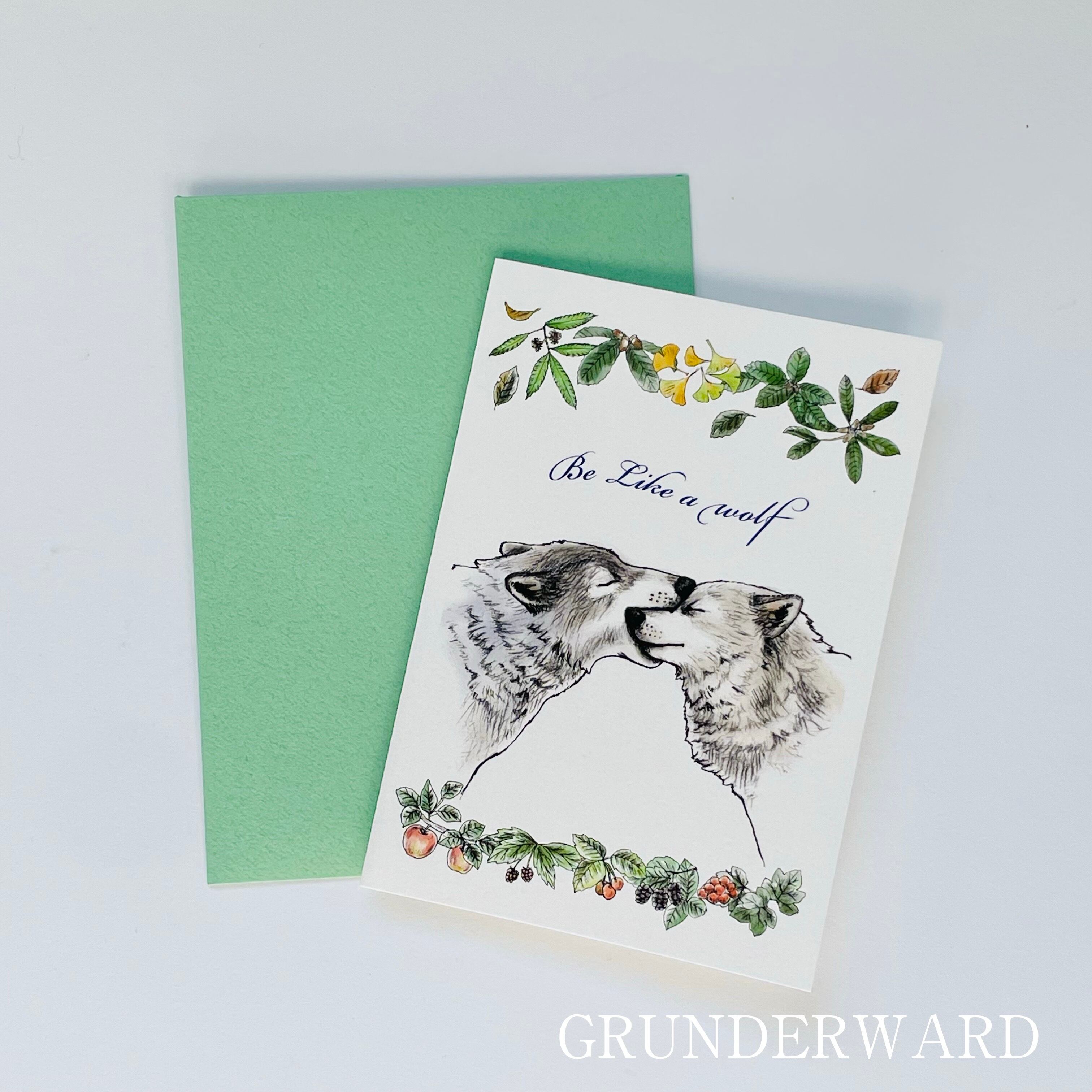 オオカミの愛情表現である甘噛みと季節の植物と木の実をあしらっています。